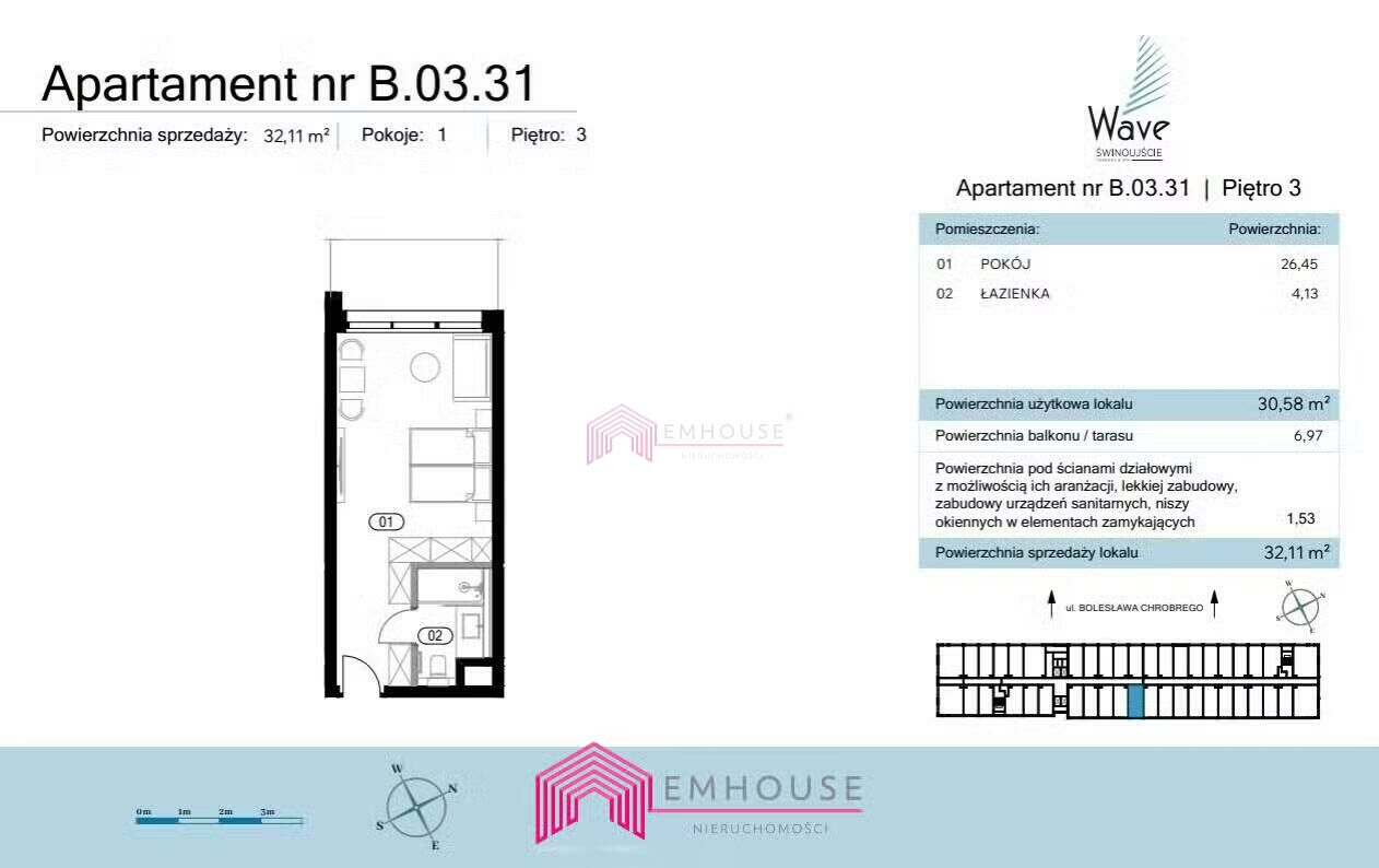 Przedstawiamy Państwu jednopokojowy apartament z balkonem B.03.31 o pow. 32,11 m, położony na trzecim piętrze inwestycji Wave Świnoujście Thermal & Spa.W skład nieruchomości wchodzi: