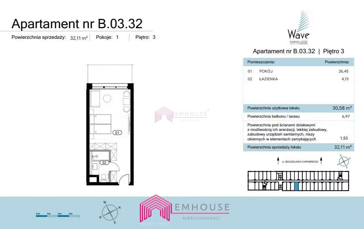 Przedstawiamy Państwu jednopokojowy apartament z balkonem B.03.32 o pow. 32,11 m, położony na trzecim piętrze inwestycji Wave Świnoujście Thermal & Spa.W skład nieruchomości wchodzi: