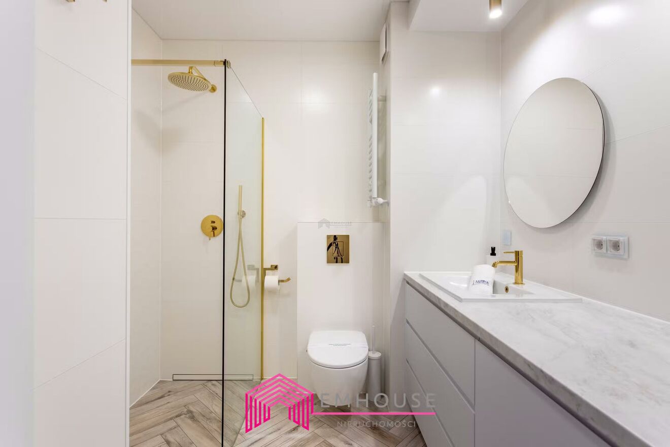 Aneks kuchenny zawiera nowoczesne meble w zabudowie oraz sprzęt AGD: lodówkę, piekarnik, płytę indukcyjną i zmywarkę. W salonie znajduje się wygodna sofa, stół z krzesłami, stolik kawowy i duży telewizor. Sypialnia została zaaranżowana z myślą o komforcie - posiada duże łóżko, pojemną szafę i telewizor. Łazienka wykończona w wysokim standardzie, z prysznicem, pralką i nowoczesną armaturą.