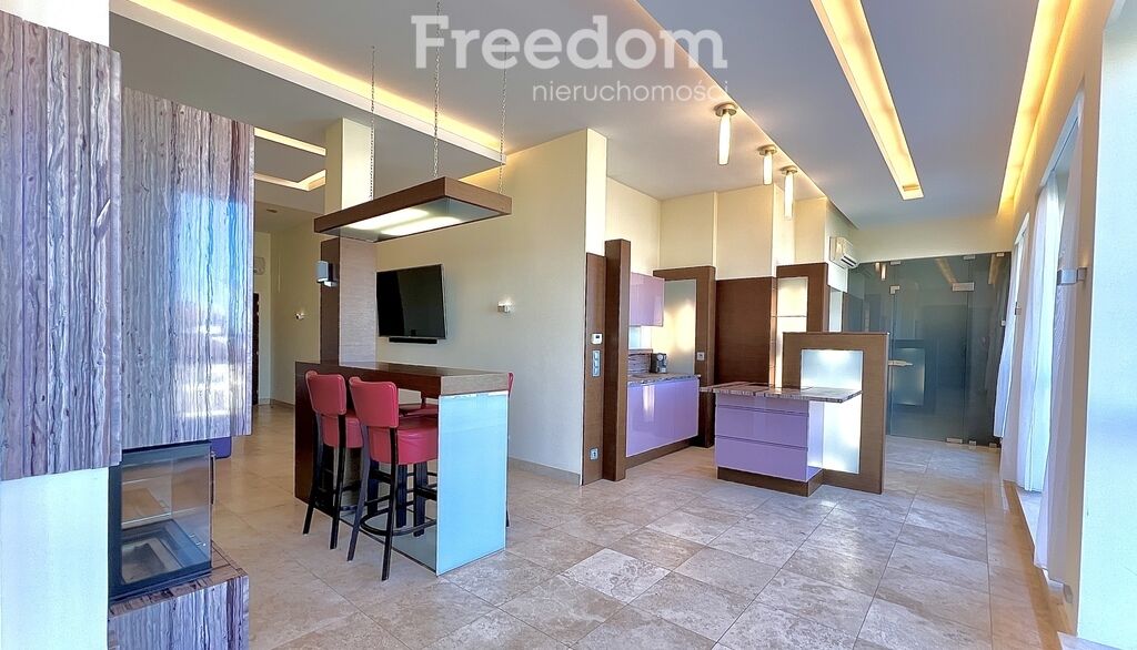 - Salon: 60 m² z otwartą częścią kulinarną, kominkiem i